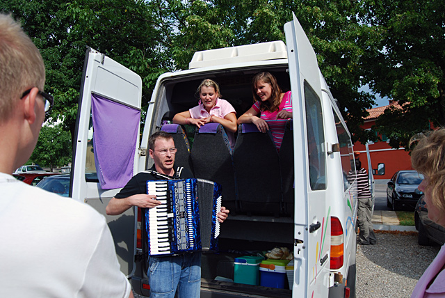 Nedelje, 13. julija, se bomo spominjali kot dneva petja in smeha. Začelo se je že zgodaj zjutraj, z zbiranjem zaspanih obrazov pred našim večnamenskim domom, kjer je za hitro prebujanje poskrbel naš zborovodja Martin z jutranjo budnico - "štamprletom".