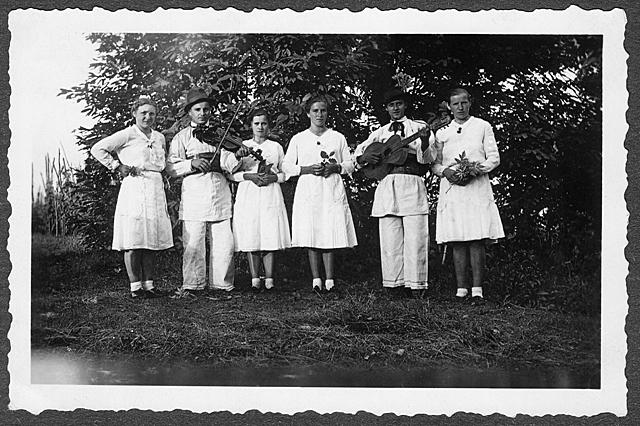 Morda še bolj dragocene za nas pa so njegove fotografije. Slavko je imel fotografski aparat že najmanj leta 1939 oz. 1940 in ni fotografiral le ljudi (kot je bilo takrat v navadi), ampak tudi pokrajino in kmečko arhitekturo. V albumu njegovih fotografij pa sem se še posebej razveselila te, na kateri so štiri kresnice in njihova spremljevalca, saj je zdaj še slikovno dokumentirano kresovanje, o katerem smo na teh straneh že pisali (gl. obvestilo Njeno prvo in zadnje kresovanje).